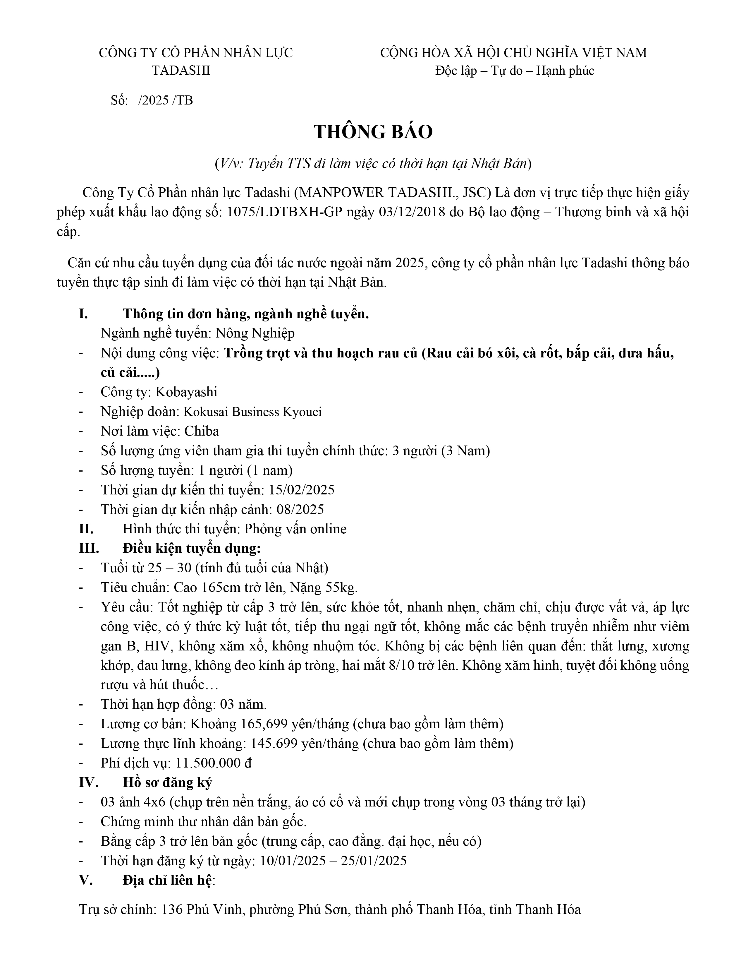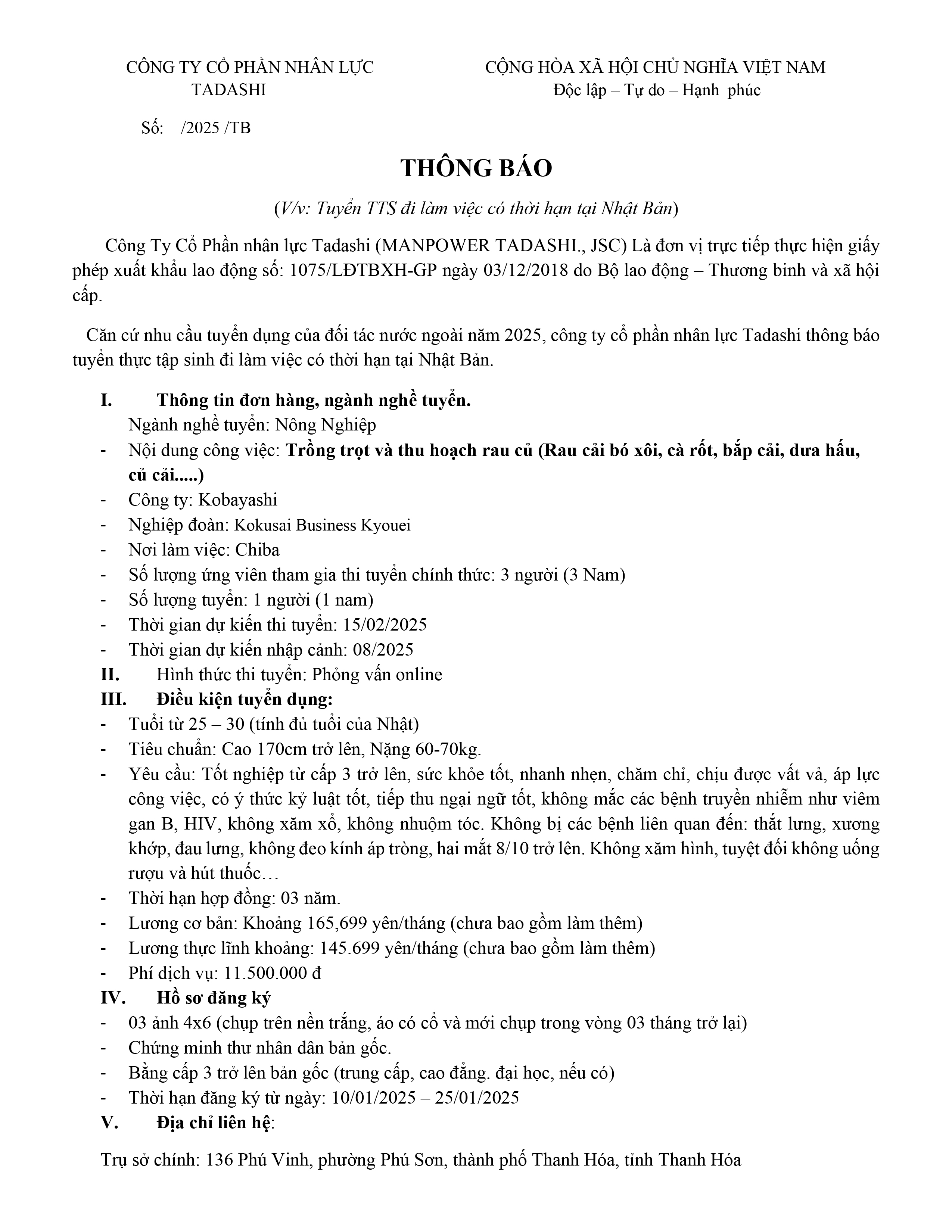 Thời gian dự kiến thi tuyển: 15/02/2025 Thời gian dự kiến nhập cảnh: 10/2025