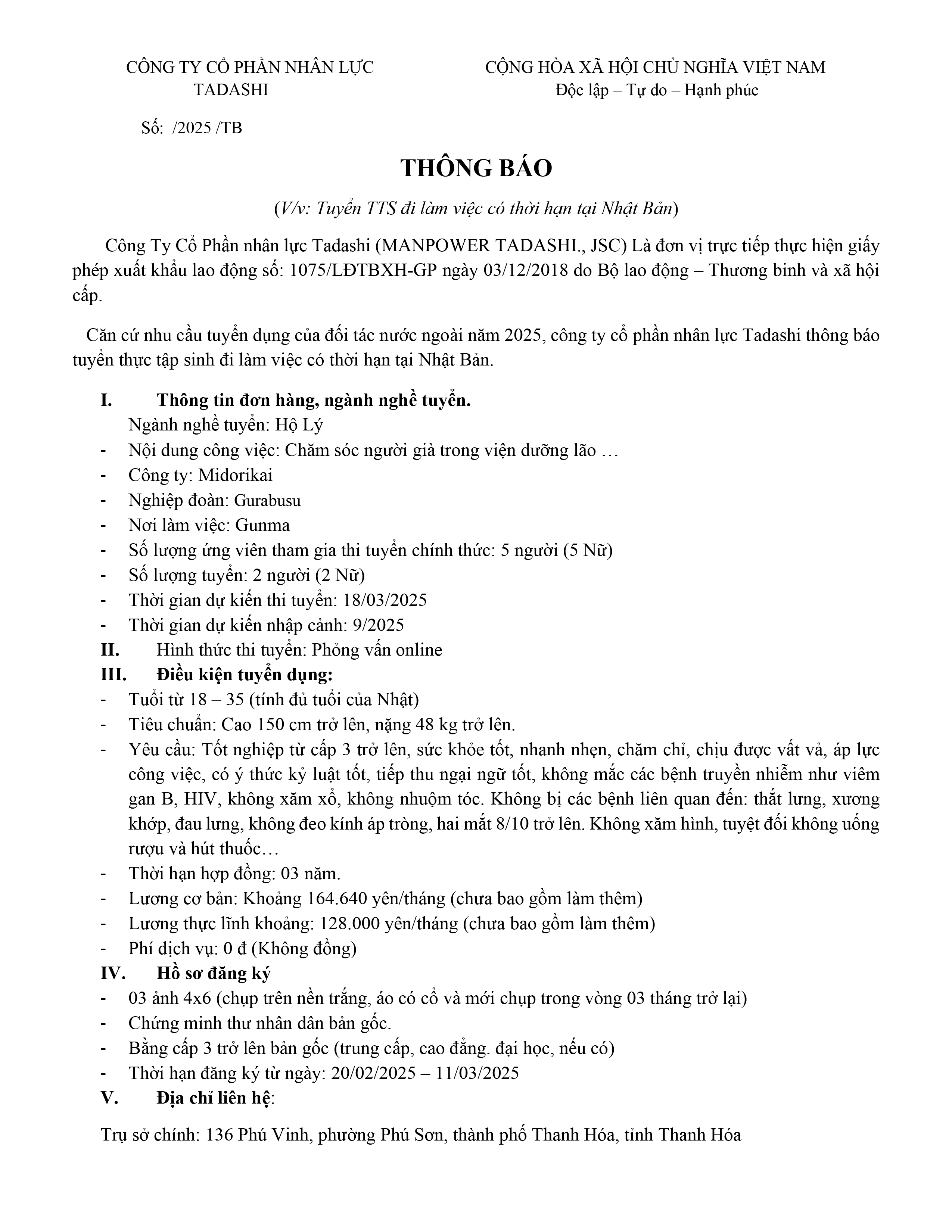 Thời gian dự kiến thi tuyển: 18/03/2025 Thời gian dự kiến nhập cảnh: 09/2025