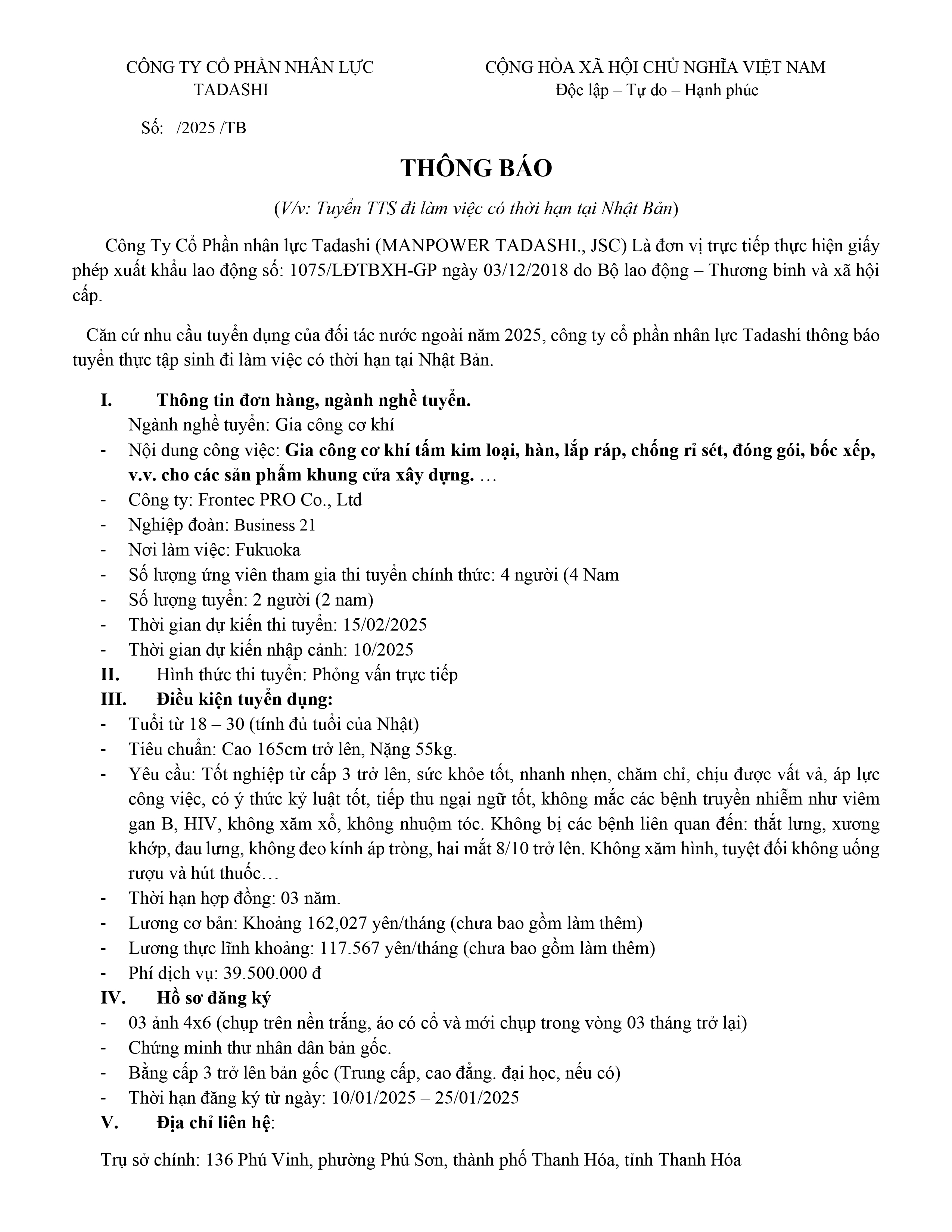Tadashi / Recruitments / Việc làm Nhật Bản / THÁNG 2 / Ngành nghề tuyển: Gia công cơ khí